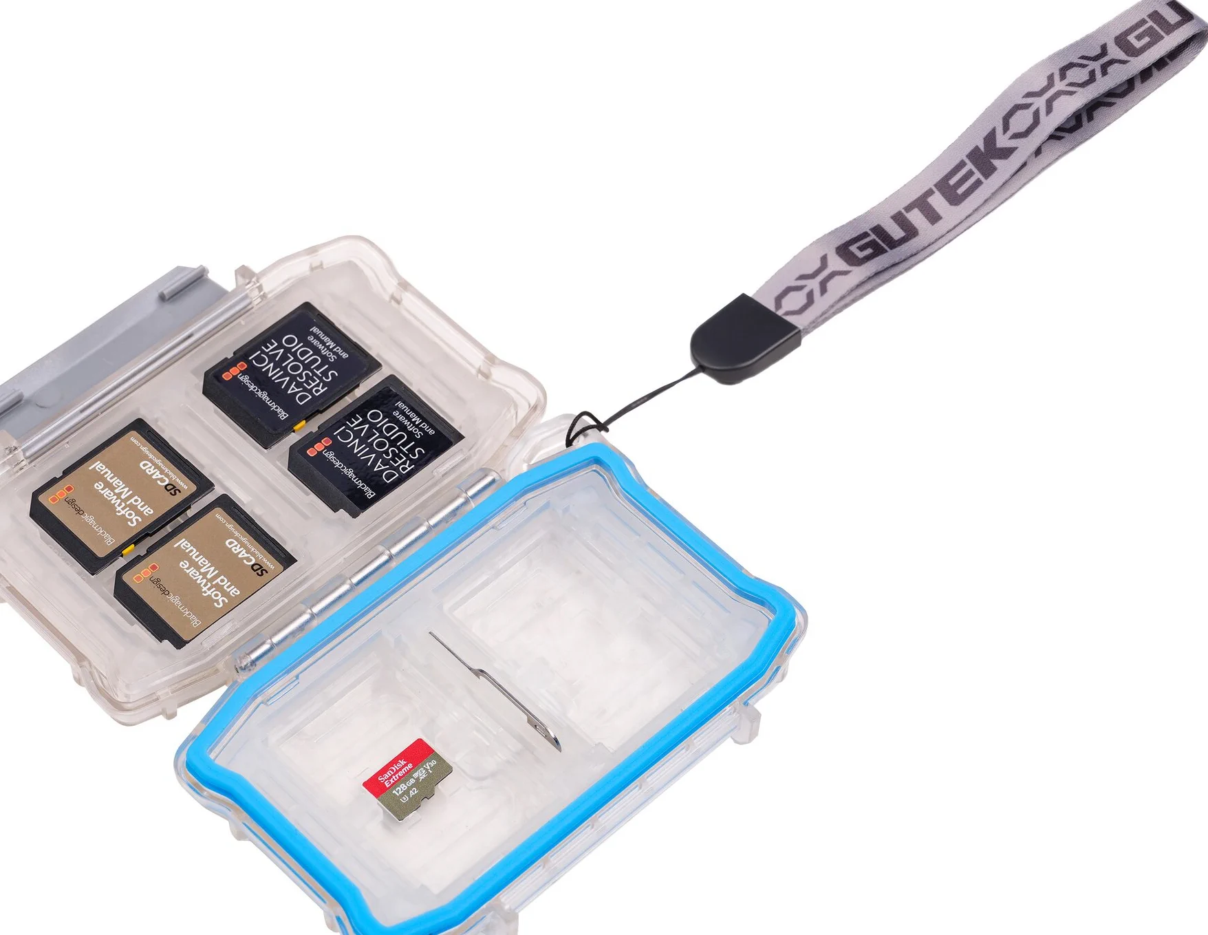 La custodia per schede di memoria T-MCC-1 di GUTEK può essere utilizzata per proteggere e organizzare più schede in un’unica custodia robusta.