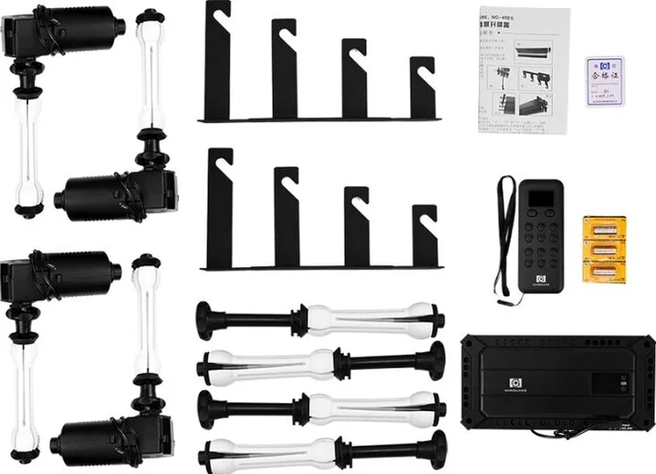 La confezione include un set di ganci, quattro assi motorizzati, una scatola di alimentazione e telecomando. Il sistema di supporto motorizzato a 4 rulli è ideale per fondali in carta, mussola o stoffa, fino a 30 kg per rotolo. Con un motore per ogni rotolo, puoi facilmente passare da un colore all’altro e finiture di sfondo per impostazioni e modifiche rapide durante un servizio fotografico.