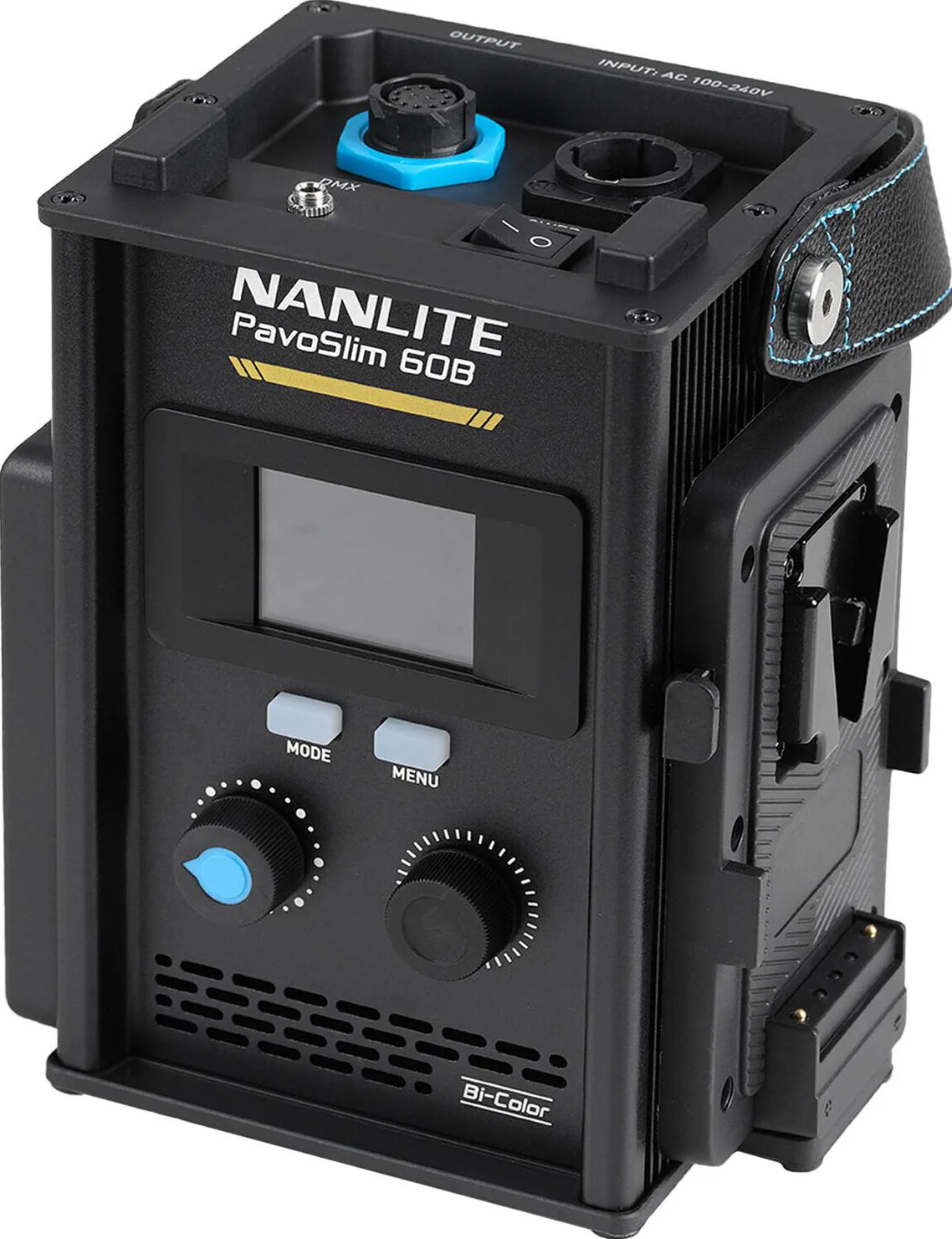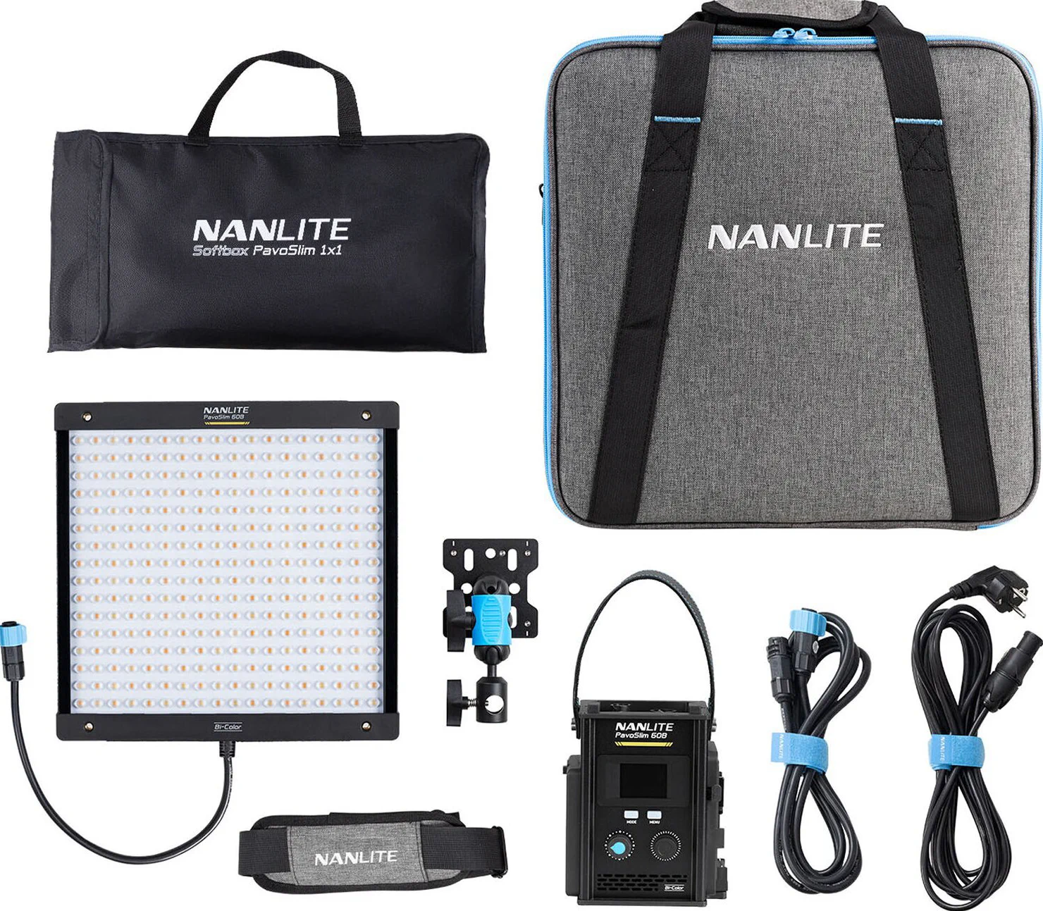 Il Nanlite PavoSlim 60B è un pannello LED 1×1 straordinariamente sottile e leggero che offre un’uscita luminosa impressionante (8156 lux, 757.7 fc @1M 5600K), regolazione dell’intensità luminosa da 0% a 100%, una gamma di temperature di colore bi-color da 2700K a 6500K, alimentazione tramite corrente alternata, batterie NP-F o V-Mount. Il kit include un’unità di controllo, softbox, 2 set di diffusori, griglia a nido d’ape, supporto girevole e una borsa compatta imbottita che contiene tutto in sicurezza.