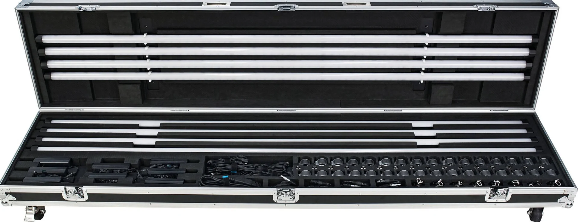 Progettato per soddisfare la richiesta dei team di produzione di trasportare i proiettori tra le diverse scene di ripresa. Ogni kit può ospitare 8 tubi per una protezione completa e fornisce anche scomparti individuali per adattatori di alimentazione, cavi di alimentazione e altri accessori compatibili.