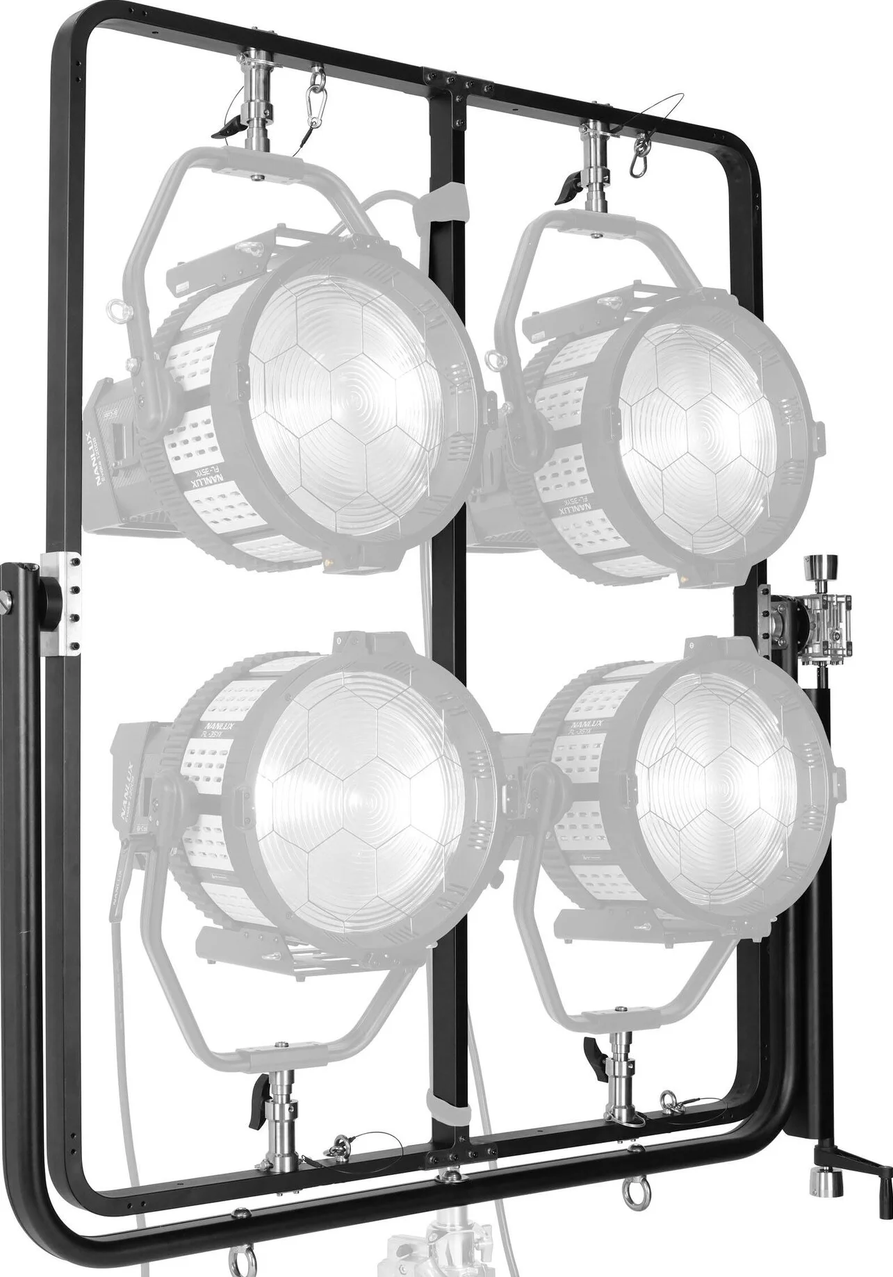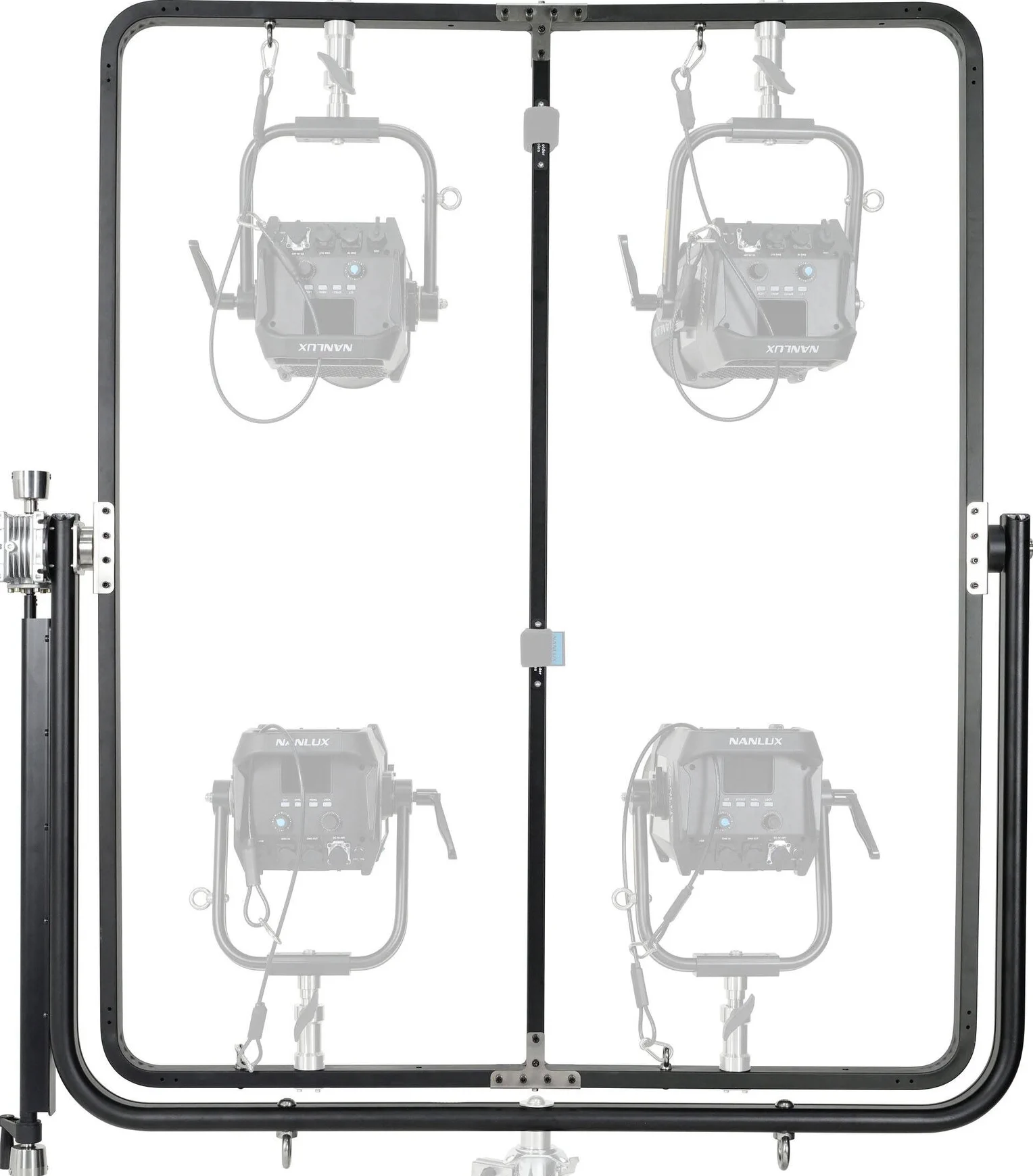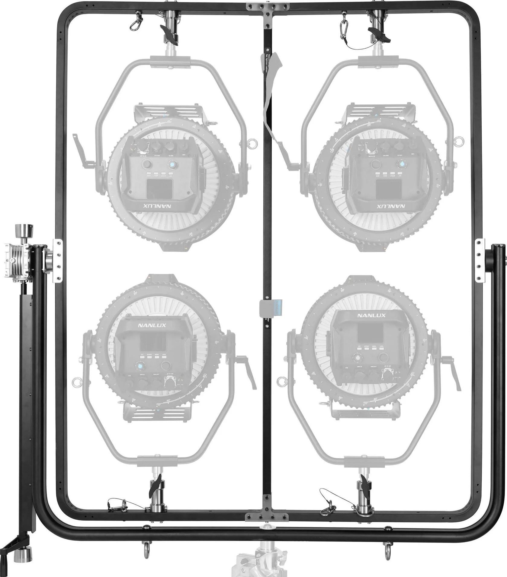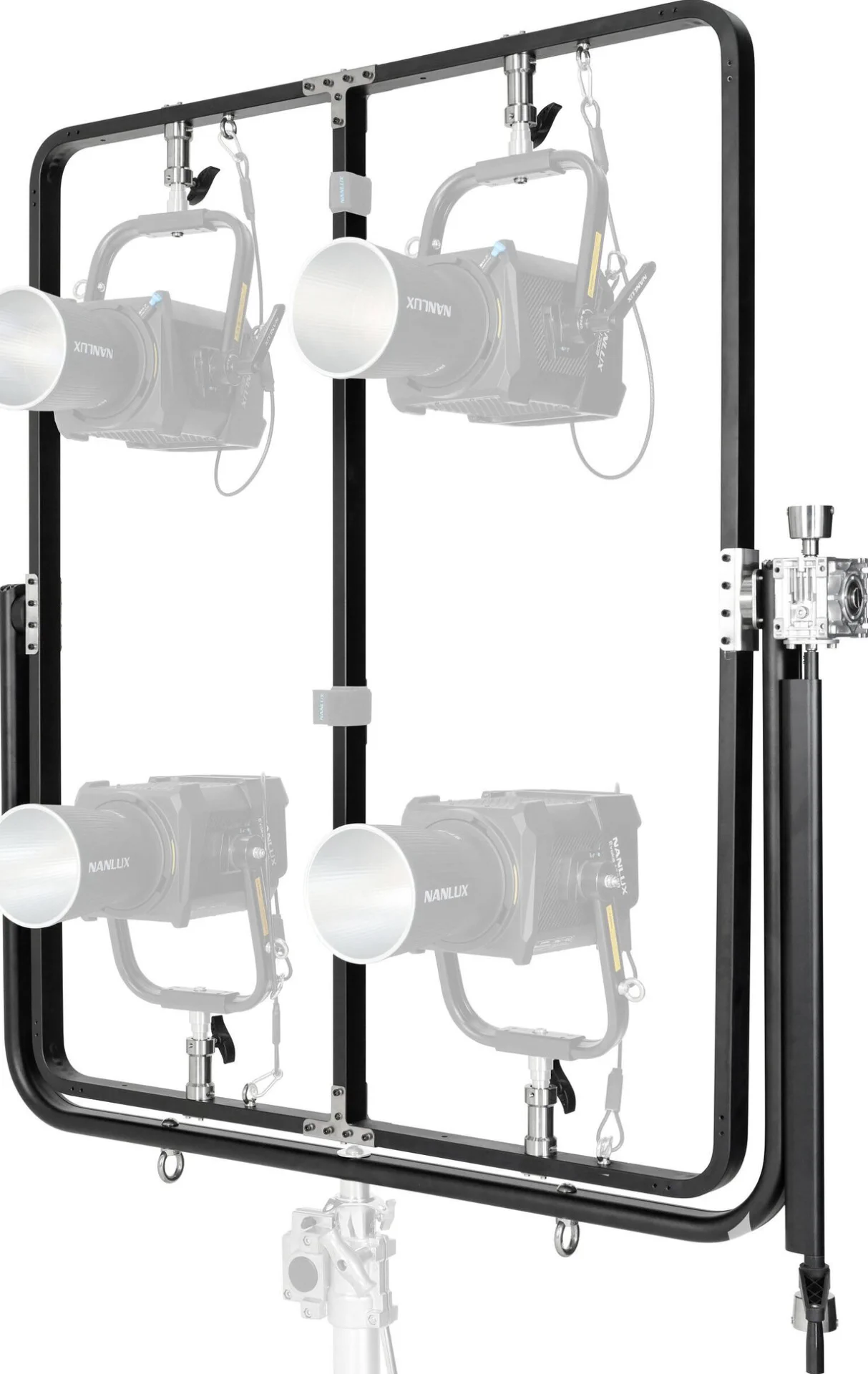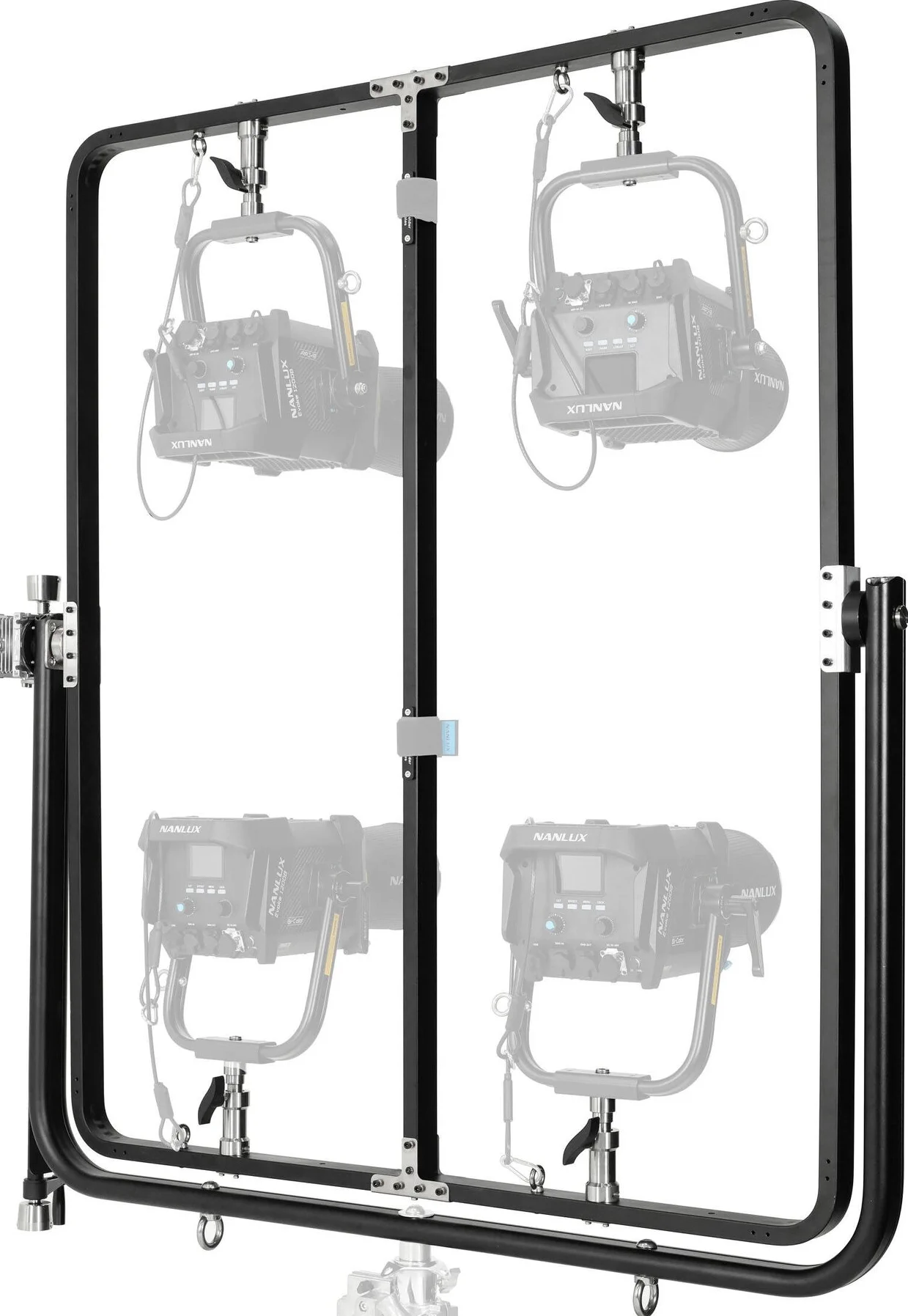 Il frame a 4 luci Nanlux FR-JP-4 con Junior Pin consente di utilizzare quattro Evoke 1200 o Evoke 1200B in un unico telaio. Costruito in lega di alluminio ad alta intensità e acciaio inossidabile, offre una struttura stabile, un’elevata capacità di carico e resistenza alle vibrazioni. È possibile montare facilmente le luci su un supporto a C compatibile utilizzando un perno junior. Supporta il panning a 360° con una maniglia di regolazione.