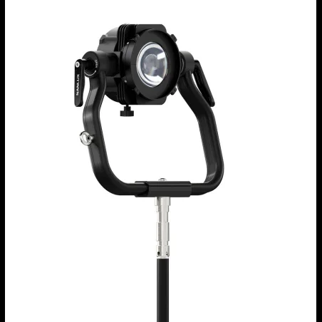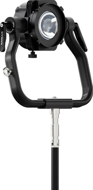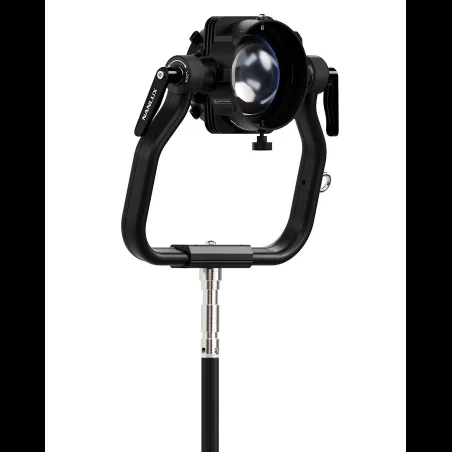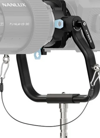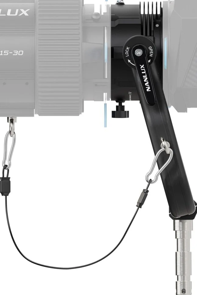 È realizzato in lega di alluminio, con alette esterne di dissipazione del calore sul supporto, per migliorare efficacemente la dissipazione del calore. Dotato di due maniglie regolabili per la sicurezza, garantisce il bloccaggio anche quando si monta un attacco di proiezione pesante. Il design sfalsato di 15° della forcella consente di ottenere un angolo di discesa più ampio su uno stativo per luci, pur mantenendo la stabilità. Allentando la manopola di fissaggio in basso, è possibile ruotare l’attacco di proiezione per regolare l’angolo del fascio luminoso. La forcella dell’adattatore di proiezione è dotata di un golfare per collegare un cavo di sicurezza (non incluso) al golfare dell’attacco di proiezione o dell’apparecchio di illuminazione per una maggiore sicurezza.