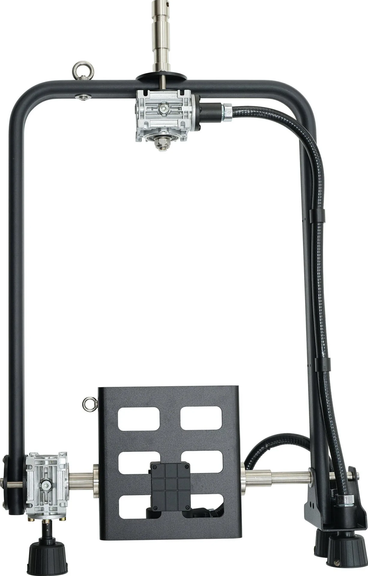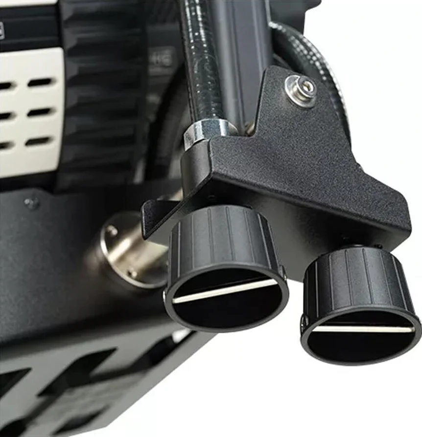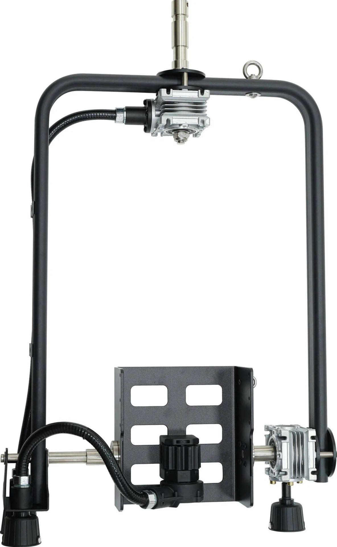 La staffa per Evoke 1200 di Nanlux perme di appendere l’apparecchio in alto su un palo o una griglia. Le regolazioni della panoramica e dell’inclinazione si effettuano innestando le coppette colorate della forcella dal basso con una lunga asta.